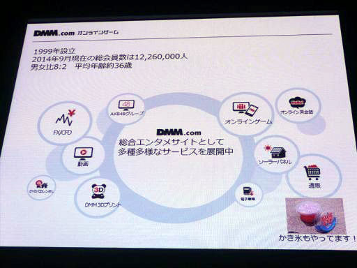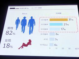 会場では,DMM.comにまつわる様々なデータも公開された。2014年9月現在の会員数は1226万人で,会員の平均年齢は36歳,男女比は8:2