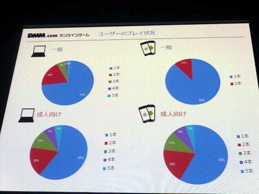 ユーザーのプレイ状況。一般向けタイトルだと1本だけプレイする人が多いが,成人向けだと複数本のゲームを掛け持ちする人が増える。とくにスマートフォンに顕著な傾向とのこと
