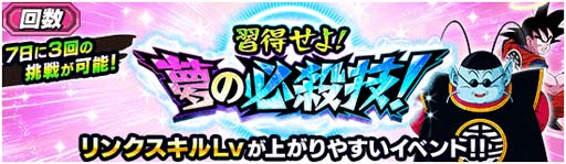 7日間で3回挑戦できる育成イベント「習得せよ!夢の必殺技!」を開催!さらにイベントのミッション報酬では、全キャラクターのリンクスキルLvが必ず上昇するイベント「界王神の崇高なる指南」に挑戦できる「指南の鍵」が最大5個獲得可能だぞ!この機会にキャラクターのリンクスキルをどんどんあげよう!
