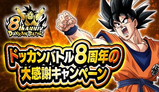 8周年を記念して「ドッカンバトル8周年の大感謝キャンペーン」を実施!ゲームをプレイして「応募券5」を集めよう!「応募券5」を占いババの交換所で欲しいプレゼントの「応募証明書」と交換すると応募ができるぞ!この機会を見逃すな!