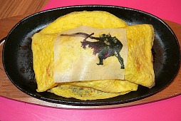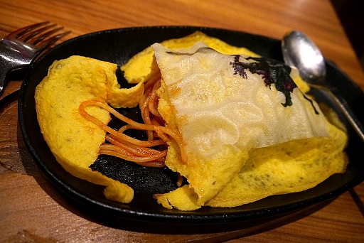 「暗黒騎士団名物団長ナポリタン」は,ナポリタンを薄い卵焼きで覆った一品だ。ケチャップの酸味と卵焼きのほのかな甘みが対照的で,交互に食べることでいろいろな味わいが楽しめた。卵焼きの上に敷かれているシートも食べることができるので,残さずいただくようにしよう。