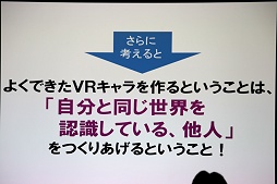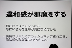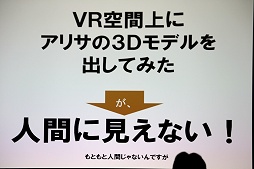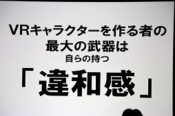 最後に挙げられたのは情報量だ。映像にリアリティをもたらすために情報量を増やす必要があるというのは古くから語られていることではあるが,VRでもただの白い壁などではリアリティが薄く,ちょっと染みがあったり模様があったほうが,格段にリアリティが増すのだという。その点,アニメキャラはトゥーンシェーディングなどで情報量が削られているため,そのままではVRには向いていないという話になる。VRでキャラクターの実在感(≒リアリティ)を追求しているときに,その第一弾の題材として,もともとのリアリティが薄いアニメキャラを選ぶのは適切でなかったということだろう。