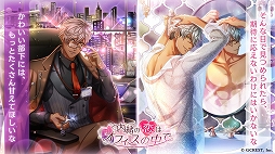 株式会社ドリームリングが開催するイベント「内緒の恋はオフィスの中で」には、リカ(CV:興津和幸)、ダグラス(CV:諏訪部順一)、ウィル(CV:石田彰)、ティーガ(CV:岸尾だいすけ)、ドライ(CV:阿座上洋平)の 5 人の社員と、オフィスでのドキドキな恋愛模様がお楽しみいただけます。覚醒前は、それぞれの着こなしスーツ姿で登場した 5 人の王子達が、太陽覚醒では、オフィスで二人の関係がバレないかドキドキのシチュエーション、月覚醒では、私にだけ見せてくれる彼らの素顔を見ることができるシチュエーションとなっています。