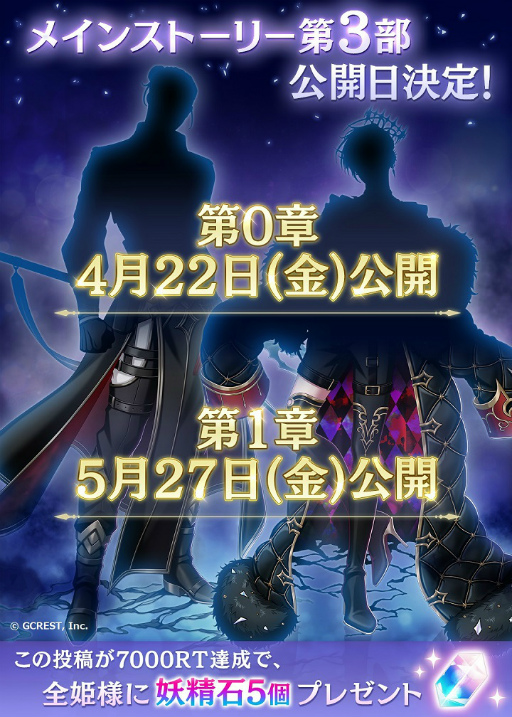 また、配信決定の告知ツイートのリツイート数が、7,000を達成すると、全ての姫様に妖精石5個をプレゼントするリツイートキャンペーンも実施いたします。