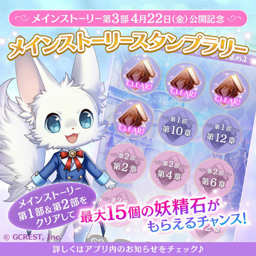 2022年4月よりメインストーリー第3部の公開記念として、メインストーリースタンプラリーを開催いたします。本キャンペーンは、メインストーリー第1部と第2部をクリアしてスタンプを集めると、最大で妖精石15個を獲得することができます。