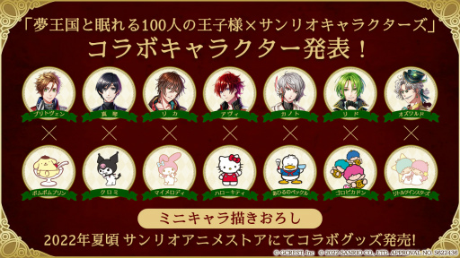 「eeo polls」にて投票が行われ、10名の王子様とサンリオキャラクターズとのコラボが決定いたしました。7組が「ミニキャラ描きおろし」でグッズとなり、2022年夏頃にサンリオアニメストアにてグッズ展開予定となります。また、3組は、等身とミニキャラそれぞれの描きおろしグッズが同じくサンリオアニメストアに登場いたします。詳細は、後日「夢100」のアプリ内や公式Twitter(@yume100prince )等でお知らせいたします。