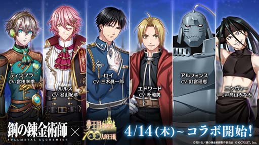本コラボレーションは、アニメ「鋼の錬金術師 FULLMETAL ALCHEMIST」から、ログインボーナスとコラボイベントにてアルフォンス(CV:釘宮理恵)が登場するほか、アプリ内コラボガチャやイベントにてエドワード(CV:朴璐美)、ロイ(CV:三木眞一郎)、エンヴィー(CV:高山みなみ)が登場いたします。また、「夢 100」からはコラボガチャではルルス(CV:谷山紀章)、コラボイベントにティンプラ(CV:宮田幸季)が登場いたします。※コラボレーションの詳細は、アプリ内のお知らせをご確認ください。