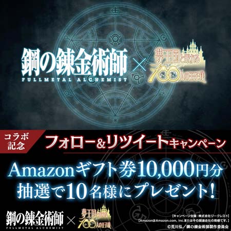 株式会社ジークレスト(本社:東京都渋谷区、代表取締役社長:大辻純平)が提供する、スマホパズルRPG「夢王国と眠れる100人の王子様」(以下、「夢100」)は、アニメ「鋼の錬金術師 FULLMETAL ALCHEMIST」とのコラボレーションを開始いたしました。
