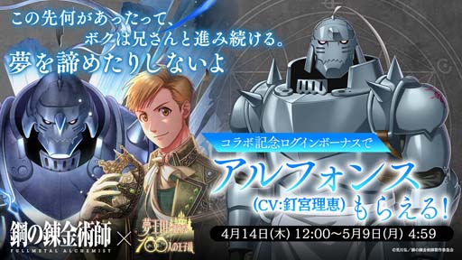 「夢100」,TVアニメ「鋼の錬金術師 FULLMETAL ALCHEMIST」とのコラボがスタート。ログインボーナスで“アルフォンス”がもらえる
