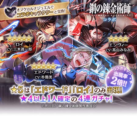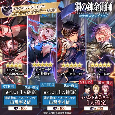 本コラボガチャでは、アニメ「鋼の錬金術師 FULLMETAL ALCHEMIST」よりエドワード(CV:朴璐美)、ロイ(CV:三木眞 一郎)、エンヴィー(CV:高山みなみ)、「夢 100」よりルルス(CV:谷山紀章)が登場いたします。ステップアップガチャでは、STEP3までプレイすると、イベント★5のキャラクターから1人確定で登場いたします。また、出現★5キャラクターがエドワード(CV:朴璐美)またはロイ(CV:三木眞一郎)のみとなる、4連ガチャも登場いたします。ガチャをプレイして手に入ったオマケのルナジュエルでも、コラボキャラクターと交換することが可能です。
