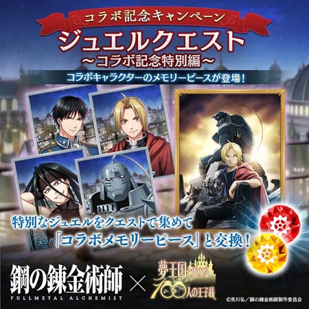 特別なジュエルをクエストで集めると、本コラボレーションキャラクターの★3 メモリーピースや、アニメ『鋼の錬金術師 FULLMETAL ALCHEMIST』キービジュアルの★4メモリーピースを手に入れることができます。