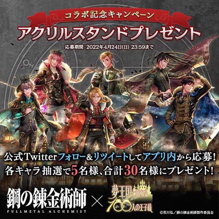 185人の王子様と恋ができる、スマホパズルRPG「夢王国と眠れる100人の王子様」とアニメ『鋼の錬金術師 FULLMETAL ALCHEMIST』とのコラボレーションを開始! 〜コラボオリジナルストーリーや、各種キャンペーンを開催!〜