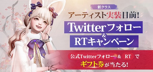 本日より、「アーティスト実装目前!Twitterフォロー&RTキャンペーン」を開催しております。『ロストアーク』公式Twitterをフォロー&対象のツイートをリツイートすることで、抽選で30名様に2,000円分のギフト券が抽選で当たります。