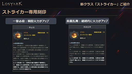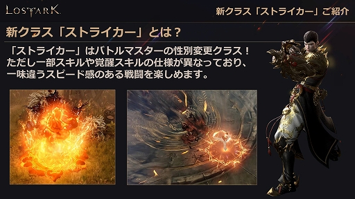 このアップデートでは,新クラス「ストライカー」が登場する。ストライカーは,素早い体術と元素を操る接近格闘が特徴だ。バトルマスターの性別変更クラスになっているが,一部スキルや覚醒スキルの仕様が異なり,ひと味違うスピード感のある戦闘を楽しめるという。