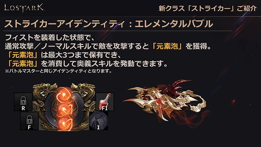 ストライカーのアイデンティティは,バトルマスターと同じく「エレメンタルバブル」となる。フィストを装着した状態で,通常攻撃/ノーマルスキルで敵を攻撃すると「元素泡」を獲得できる。元素泡は最大3つまで保有でき,元素泡を消費して「奥義スキル」を発動できる。