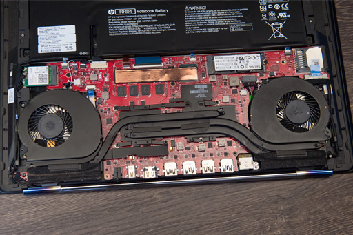 前述のとおり,OMEN 15はCPUにi7-4710HQ,GPUにGTX 860Mを搭載している。厚さ2cm未満の筐体で,これらをいかに冷却,排熱するかというのは大きなハードルとなる。