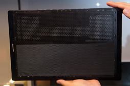 また,底面のトライアングルドット内部には,パンチングメタルが貼られているのだが,パンチングメタルの穴はトライアングルドットと微妙にズレており,これが防塵フィルターとしてうまく機能するようになっているのだそうだ。