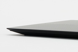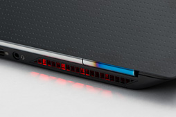 いま,三角形という話をしたが,OMEN 15では,三角形のような,エッジの効いたデザインで全体が統一されている。たとえば底面で吸気孔以外の部分が三角形型の凹凸を敷き詰めた滑り止めになっていたり,本体側面が,下に向かって切れ込むようなデザインになっていたり,といった具合だ。