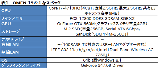 OMEN 15は,NVIDIA独自のスイッチャブルグラフィックス技術「Optimus」に対応しており,リファレンスのGeForce Driverを導入できることから,今回は表1のとおり,テスト開始時点における最新版ドライバである「GeForce 347.09 Driver」を導入してのテストとなる。