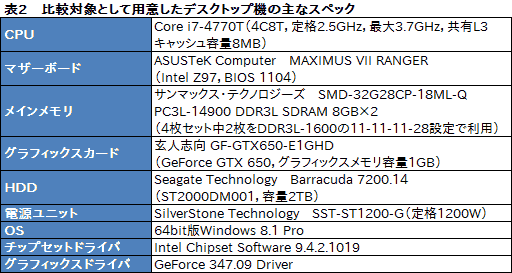 以下,比較対象のデスクトップPCを「i7-4770T+GTX 740」と表記すると断りつつ,テスト結果を順に見ていくこととしよう。