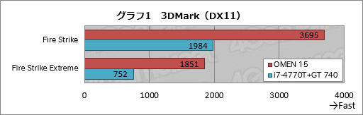 グラフ1は,3DMarkのDirectX 11 API採用テスト「Fire Strike」と,その「Extreme」プリセットにおけるスコアをまとめたものだが,OMEN 15の優位性は明らかだろう。とくに,より描画負荷の高いExtremeプリセットで2.5倍近いスコア差を叩き出しているのが目を引く。
