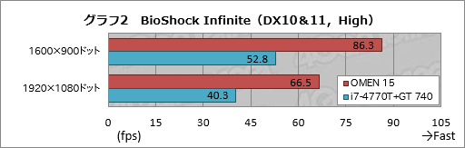 この傾向自体は,グラフ2にスコアをまとめた「Bioshock Infinite」でも大きくは変わらない。OMEN 15は,i7-4770T+GT 740に対し,63〜65%程度高いスコアを示している。4Gamerのベンチマークレギュレーションが合格ラインとする平均60fpsを,OMEN 15が解像度1920×1080ドットで悠々上回っているのは要注目といえ,いわゆる最新世代のグラフィックス技術を採用したようなものを除けば,FPSも十分に高い解像度で快適にプレイできると述べてよさそうだ。