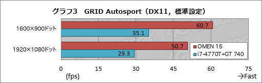 続いてGRID Autosportのテスト結果がグラフ3だが,ここでもOMEN 15はi7-4770T+GT 740に対して70%以上高いスコアを記録している。レギュレーションでは平均40fpsがプレイアブルかどうかの目安となるが,OMEN 15ではそのラインをまったく危なげなくクリアできている点に注目してほしい。