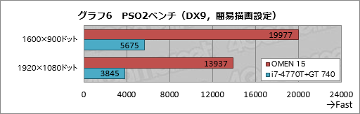 グラフ6にスコアをまとめたPSO2ベンチでは,OMEN 15とi7-4770T+GT 740のスコア差はさらに広がる。ご覧のとおり,驚きの3.5倍超えだ。グラフ画像をクリックすると,平均フレームレートを表示するようにしてあり,そちらを見てもらうと,フレームレートの違いは約76%なのだが,それでも圧倒的であることに疑問を差し挟む余地はないだろう。