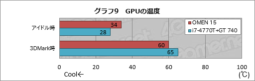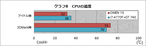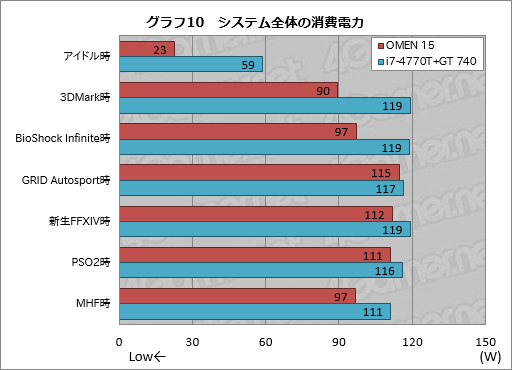 その結果がグラフ10で,アイドル時のスコアはOMEN 15が貫禄のテスト結果を示している。一方,アプリケーション実行時のスコアは,OMEN 15がi7-4770T+GT 740より2〜29W低かった。液晶パネルというハンデを抱えていることを考えれば,これは相当に優秀なスコアと言っていい。