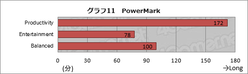 最後にグラフ11は,Futuremark製のバッテリーベンチマーク「Powermark」(Version 1.2.0)で,バッテリー駆動時間を計測したものとなる。
