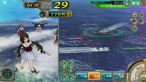 また艦隊は一列に並ぶ,いわゆる単縦陣をとっており,敵艦隊と並走するように位置取ると「同航戦」,すれ違う進路だと「反航戦」,T字に並ぶと「T字有利/不利」が発生する。この位置取りは,攻撃の命中率や被弾のしやすさに影響するので,操舵輪と船速レバーで有利なポジションを保ちつつ,攻撃するというのが戦闘の基本だ。