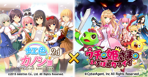 スマートフォン向けよめいく恋愛シミュレーションゲーム『虹色カノジョ2d』と、弾丸アクションRPG『ウチの姫さまがいちばんカワイイ』がコラボレーション!