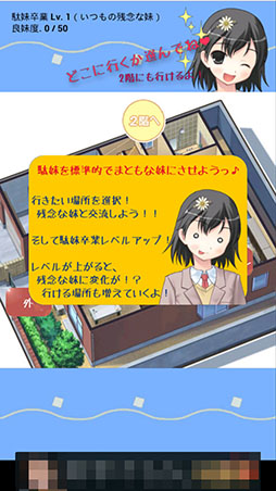 良妹度が一定値まで溜まると“駄妹卒業レベル”が上昇し,それに伴い行ける場所が増え,会話の内容も変わっていく。なお,駄妹卒業レベルは初期状態だと“いつもの残念な妹”で,レベルアップに応じて“もっと残念な妹”“もっとも残念な妹”といった具合に変化していく。「前よりひどくなっているんじゃ?」と思うかもしれないが,気のせいである。