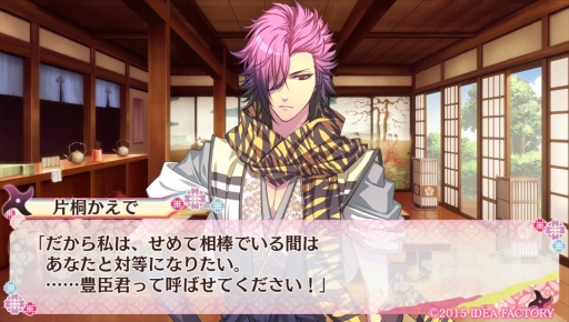 すぐに「側室にしてやろう!」と上から目線で言ってくる秀虎も,今回の相棒候補です。相棒に彼を選ぶと,自由を満喫したいらしく「付きまとうのは諦めよ」と言われ,ただ純粋に相棒として今後の相談をしたかった主人公は,その言葉に動揺してしまいます。