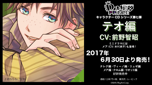 NHN PlayArt株式会社(本社:東京都港区、代表取締役社長:加藤雅樹、以下NHN PlayArt)が開発するスマートフォン向け乙女ゲーム『DAME×PRINCE』(デイム×プリンス)の、キャラクターCDシリーズ第7弾テオ編が、2017年6月30日(金)に発売されます。それに伴い、テオ役を務めた前野智昭(まえの ともあき)さんのレコーディングコメントを公開いたします。