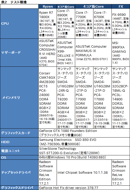 今回,比較対象としては,表1でも取り上げたi7-6900Kと,i7-7700K,i7-6700K,FX-9590を用意した。AMDがライバルと位置づける,同じ8コア16スレッド対応CPUとの比較,そして前世代最上位モデルとの比較は必須として,さらに,今日(こんにち)においてユーザー数の多い4コア8スレッド対応CPUも2製品加えた格好だ。