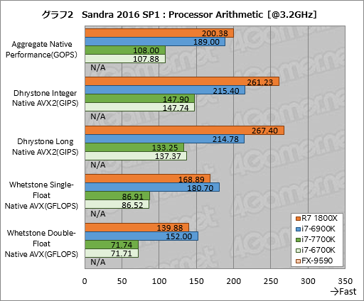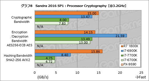 というわけでグラフ1,2は,CPUの演算性能を見る「Processor Arithmetic」のスコアだが,総合スコアを示す「Aggregate Native Performance」でRyzen 7 1800Xはi7-6900Kに対して約12%高いスコアを示した。3.2GHzに動作クロックを揃えるとそのギャップは約6%に縮まるものの,少なくともRyzen 7 1800Xの“素性”が良さそうなことは,これで想像できるのではなかろうか。