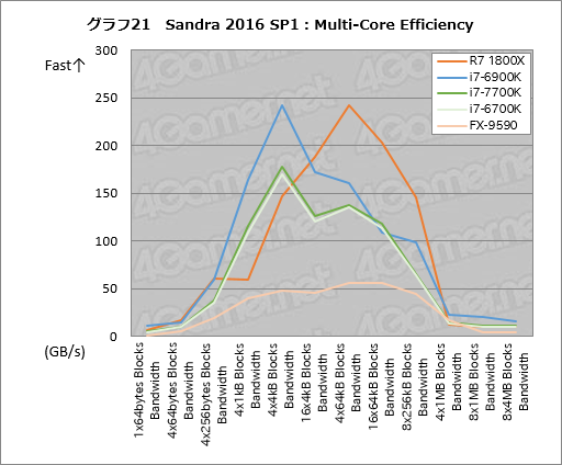 メインメモリの帯域幅を見る「Memory Bandwidth」のテスト結果がグラフ23,24だが,ここは当然ながら,4chメモリアクセスを行うi7-6900Kの独擅場。もっともRyzen 7 1800Xは,高いメモリクロックを活かし,総合スコアでi7-7700Kに対して約11%,i7-6700Kに対して約24%,FX-9590に対して約79%高いスコアを示している。