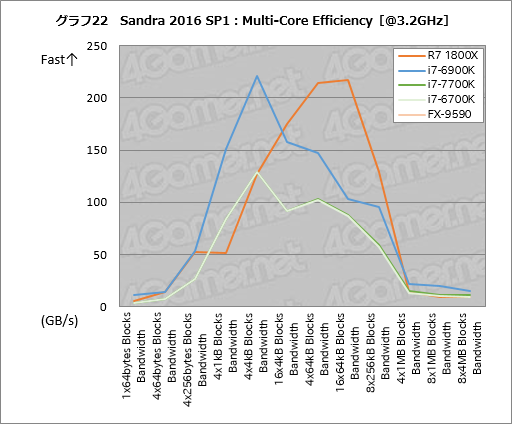 グラフ21,22は,CPUコア間のデータ転送帯域幅を見る「Multi-Core Efficiency」の結果である。グラフ画像をクリックすると,実スコアのまとまった表3,4を表示するようにしてあるので,適宜,別タブで開くなどして,参考にしてもらえればと思う。