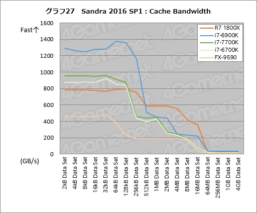 キャッシュの帯域幅を見るCache Bandwidthの結果がグラフ27,28である。ここでもグラフ画像をクリックすると表7,表8で実スコアを確認してもらえるようにしてある。