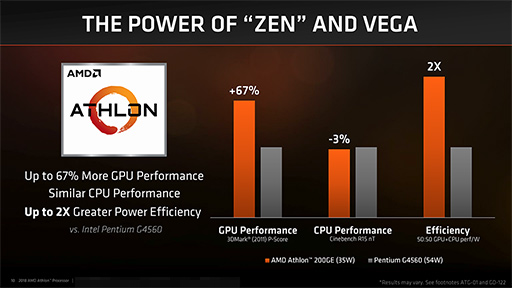 AMDでは,Kaby Lake世代の2コア4スレッド対応CPU「Pentium G4560」と比較した場合,Athlon 200GEはCPU性能こそわずかに下回るものの,GPU性能は67%上回り,電力当たりの処理性能では2倍に達すると主張している。TDP(Thermal Design Power,