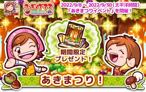 ゲームソフトの企画・開発・販売を行う株式会社オフィス・クリエイト(本社:日本)は、2022年9月8日より、 iPhone/Androidアプリ「クッキングママ お料理しましょ!」の秋祭りイベントを開催いたします。