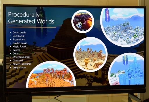 その世界もDoom Lands(滅びの土地),Golden Realm(金の王国),Deep Ocean(深海)と多彩で,ランダム生成によってプレイヤーそれぞれで違った,自分だけの世界が創れるところが醍醐味だという。また,新しい冒険の舞台や建設エレメントも,DLC「New Skyward」として発売に合わせて配信される予定だ。