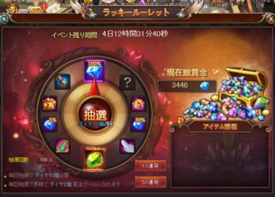 イベント期間中、ログインするとなんと!「当選率100%」のルーレットが回せます。有料アイテム10ダイヤ相当のプレゼントが獲得できます。スーパーダイヤも当たっちゃうかも!