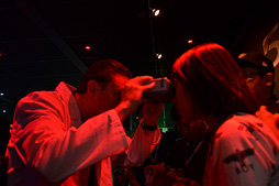 | 白衣を着たスタッフが,来場者の二眼の瞳の距離を計測にやってくる。写真は計測の様子 |