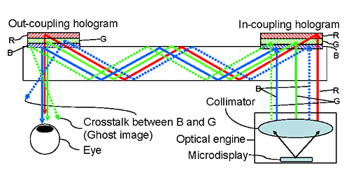 ホログラフィック平面導光板とは,回折格子を応用した光学部材で,簡単にいえば,プロジェクタからの映像を,わずか1mm程度の厚さのレンズ内で何度も反復反射させながら,眼前にまで到達させるものだ。