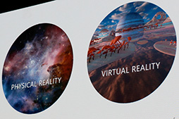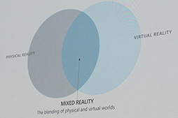 ただしMicrosoftは,HoloLensで実現される仕組みを「複合現実(Mixed Reality,以下 MR)」と表現しており,従来言われていたARとは明らかに区別している。MRといえば,現実の映像と人工の映像を混在させる技術としてすでに知られているのだが,ここでいうMRはかなり違った意味のものであるようだ。同社によれば,MRは物理現実(Physical Reality)とVRの中間に位置し,両者がミックスしたものだと説明する。HoloLensとVR HMDを装着した2人によるデモもそれを示したもので,現実に近いHoloLensと,完全に仮想世界として描き出されるVR HMDで,共通の体験が可能であることを示していたわけだ。