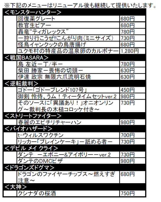 カプコンバーのグランドメニューが11月2日にリニューアル。新メニューは50種類以上
