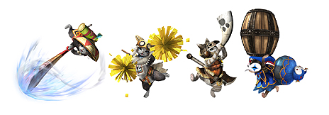 雇用するオトモアイルーごとに、修得するサポート行動やオトモスキルが異なる。オトモ道場の特別なメニュー「伝授」で、他のオトモに教えることも出来るので個性的なオトモアイルーを仲間にしていこう!