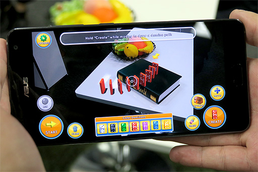 4月13日に東京・秋葉原で行われた発表会では,ZenFone ARにプリインストールされたARアプリのデモが披露された。ミニゲーム的なアプリもいくつかあり,スキャンした物体の上にドミノを並べて,ドミノ倒しを遊べるミニゲームは,ARならではの体験ができるちょっと面白いゲームだった。